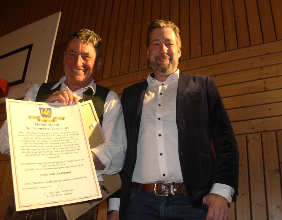 Welche Auszeichnungen gibt man einem Sebastian Baumann, der 52 Jahre lang das Oberaudorfer Musikleben maßgeblich geprägt hat, nicht nur in der Musikkapelle, sondern auch in vielen anderen Formationen sämtlicher Stilrichtungen von Jazz bis Schrammelmusik, sowohl als Tubist als auch als Kontrabassist. Da ist eine Ernennung zum Ehrenkapellmeister das Mindeste und gleichzeitig das Höchste, was Vorstand Christoph Höflinger im Namen seiner Kolleginnen und Kollegen vergeben kann. Und da sich so ein Musiker-Leben auf den ganzen Ort auswirkt, kann sich die Gemeinde nur anschließen und verleiht Sebastian Baumann die Ehrenurkunde und Ehrenmedaille für sein kulturelles Schaffen durch 1. Bürgermeister Dr. Matthias Bernhardt.