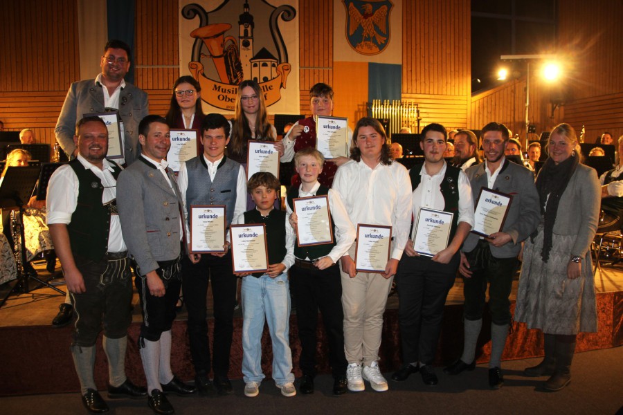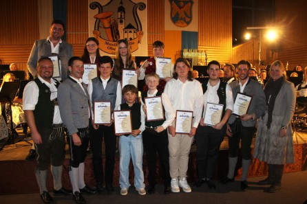Umringt von den jungen Jubilaren Wasti Baumann (oben links) und Alois Kammerloher (zweiter von rechts), Jugendwart Andreas Heppel (links) und Vorstand Christoph Höflinger (zweiter von links) freuen sich die Jungmusiker über ihre Leistungsabzeichen in Bronze und Silber, überreicht von Kathrin Flory (rechts) beim diesjährigen Dreikönigskonzert am 05.01.2026.
